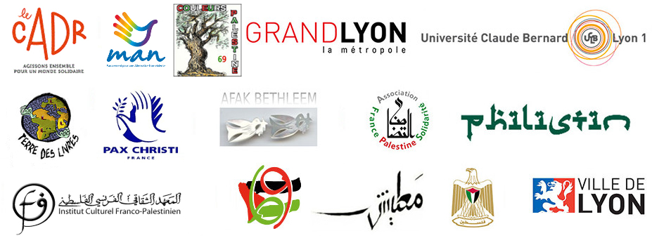Afak Bethleem, Association des médiations philosophiques Lyon 3, AFPS Union régionale (Ain, Ardèche-Drôme, Albertville, Chambéry, Grenoble-Isère, Haute-Savoie, Loire, Puy de Dôme, Rhône), Albertville – Jourdain Vallée Solidarité, C.A.D.R (Collectif des Associations de Développement en Rhône-Alpes), Ciné-Club Kinoks Lyon2, Collectif 69 Palestine , Couleurs Palestine 69, Enjeux sur Images, Le Philistin Importateur Palestine / France, Institut culturel franco palestinien, Grand-Lyon Métropole, Librairie Terre des livres, Maalish, MAN, Objectif jeunes Givors , Pax Christi France, Service Culturel Mission de Palestine France, Université Claude Bernard Lyon 1, Ville de Lyon.